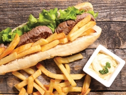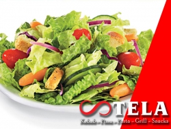 warm, krokant met sla, ui, tomaat, wortel, komkommer, saus naar keuze